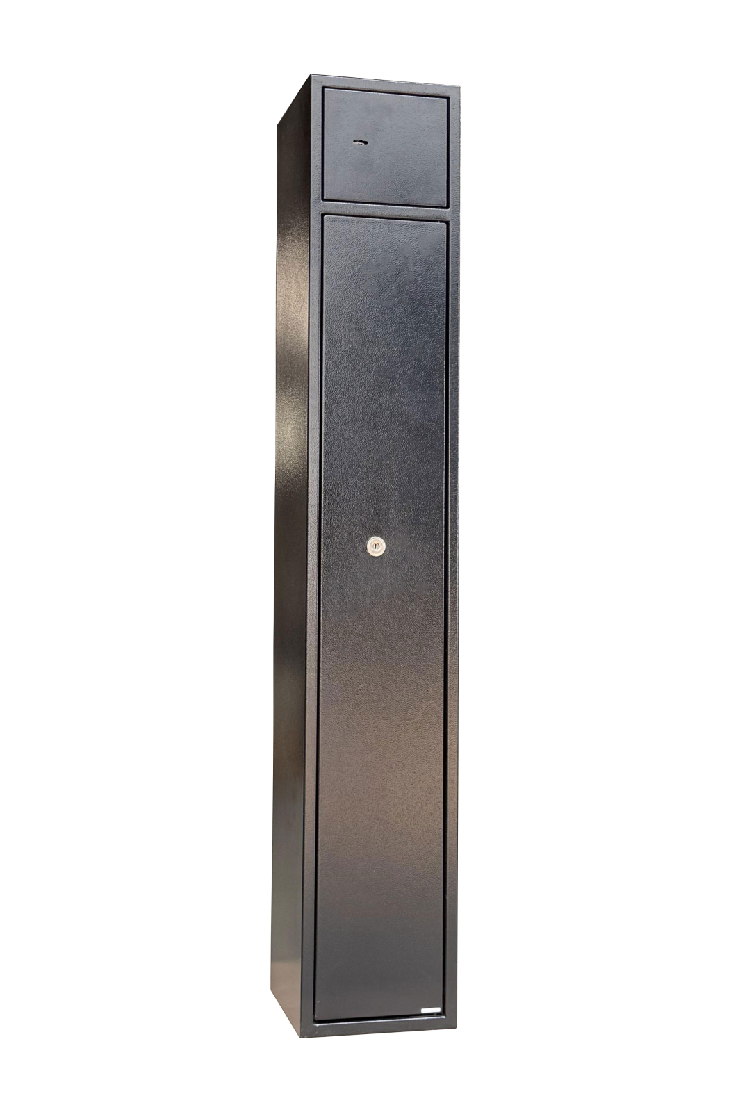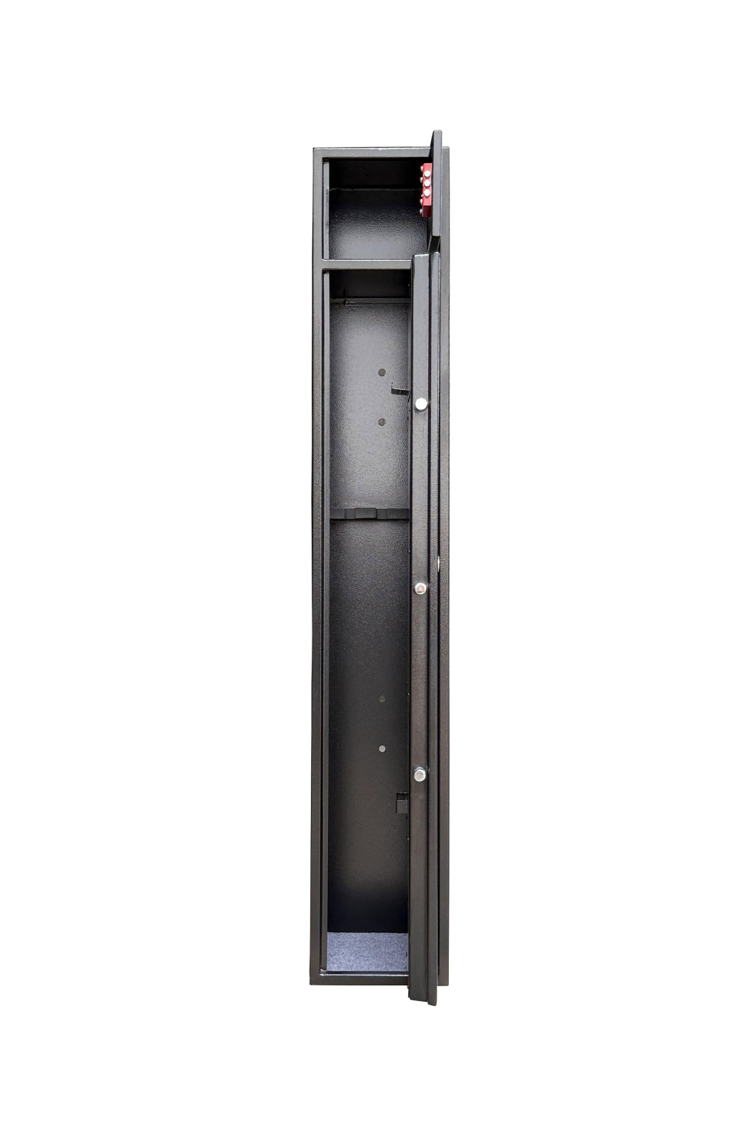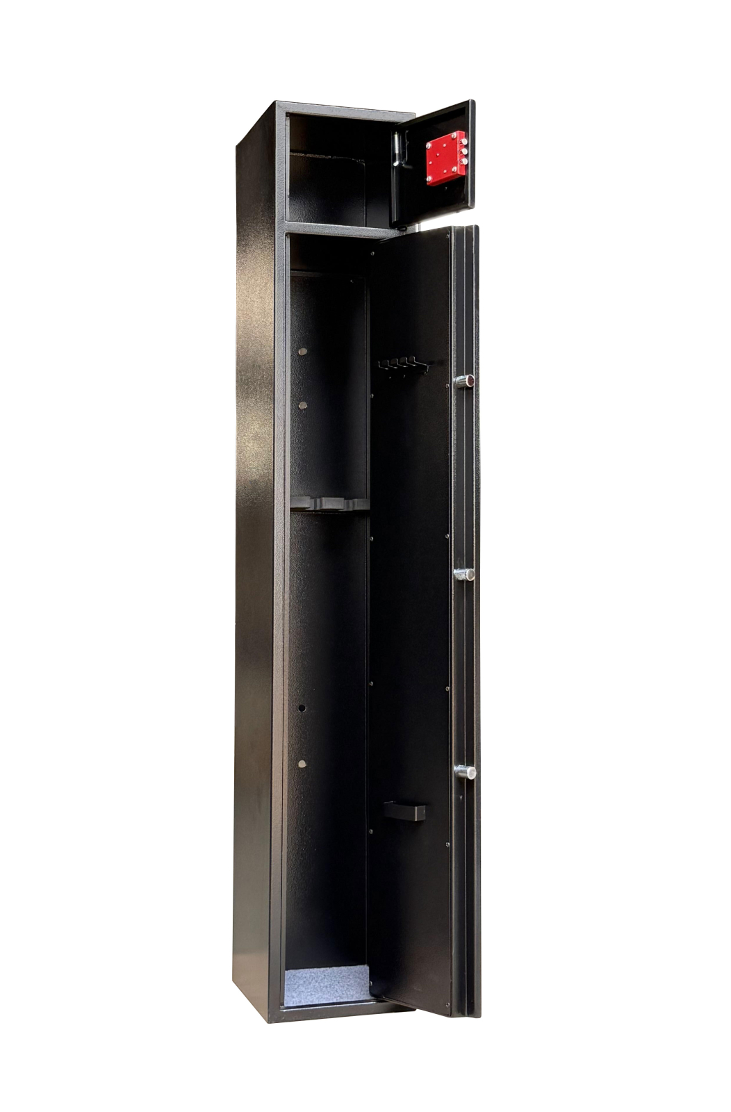 Dulap de arme cu 2 compartimente separate pentru 3 arme lungi si munitie. Inaltimea maxima a armei 125 cm. Suport pentru tija de curatare pe interiorul usii, suport pentru arme. Balamale interioare - unghi de deschidere a usii de 90 °.